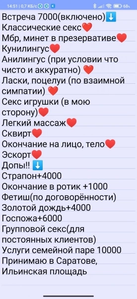 04.11.2025 22:14 №68711Привет я Оксана работаю в любое Время суток звоните пишите ватсап или телеграм+7 (917) Показать номер